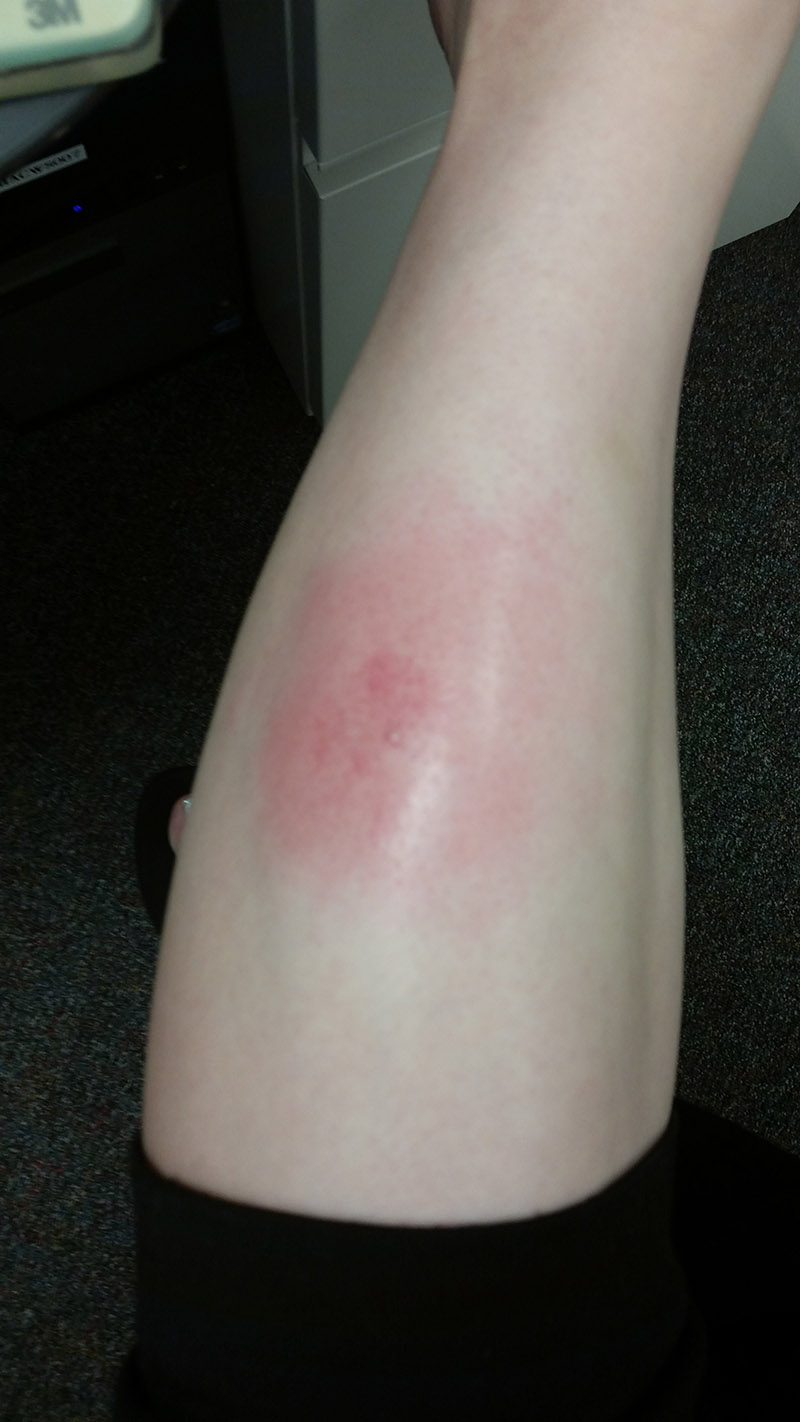 made my way to work. I was only at my desk for a few minutes when I decided to look at the wound again. I was kind of surprised by what I saw. In the hour since I’d left home, the site of the sting had become larger, redder, and a little puffy. I theorized that my pants had irritated it or that I was having a bizarre delayed allergic reaction (in case you’re wondering, that’s not possible).