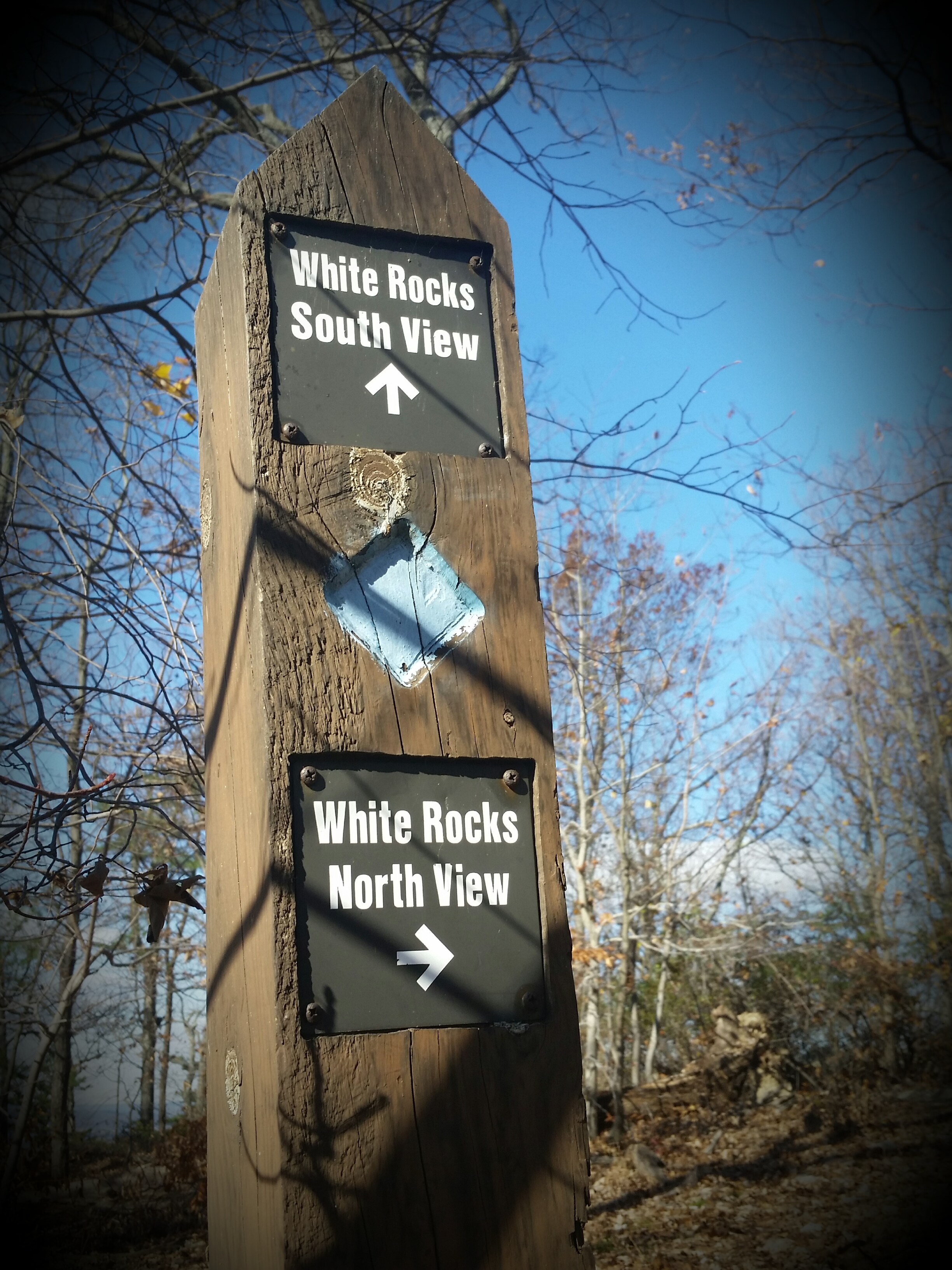 After an extended photo shoot, we went back on the blue blazed trail for another mile. This is when things got confusing. Something about the way the trail posts were marked was very misleading and made it seem like we were about to reach the West View parking lot. So when we walked over a ridge and saw parked cars near a road, we naturally assumed this was the lot at the end of the trail.
